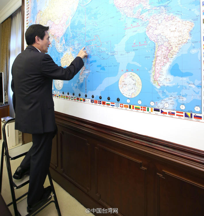 “總統(tǒng)”辦公室內(nèi)有各式各樣的地圖,馬英九喜歡站在梯子上研究巨大地圖。