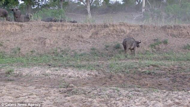 此時(shí),機(jī)智的水牛趁獅子來(lái)不及注意,偷偷地站了起來(lái)。
