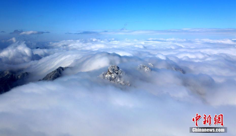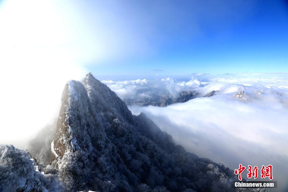 1月7日,連續(xù)降雪之后,位于河南洛陽(yáng)的道教圣地老君山雪后初晴,海拔2000米的伏牛山主峰上,白雪皚皚、銀裝素裹,加之云海浮現(xiàn)與藍(lán)天白云交相輝映,絕壁道觀似瓊樓玉宇幻如仙境美不勝收。圖為云海與藍(lán)天白云交相輝映。王中舉 攝