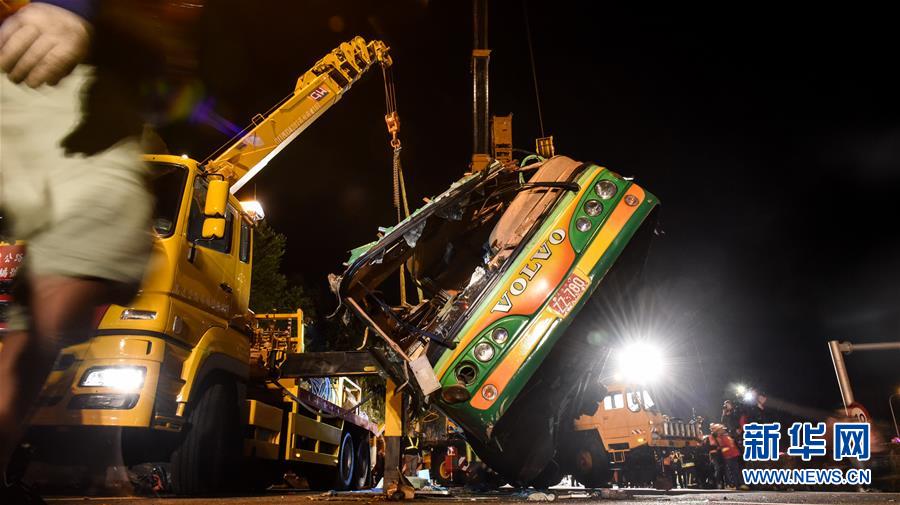 2月14日,事故車輛被吊車吊起。據(jù)臺灣消防部門2月14日零時許發(fā)布的消息,13日晚發(fā)生的翻車事故已造成32人死亡,受傷的12人已全數(shù)送醫(yī)。新華社記者從臺灣公路警察部門獲悉,游覽車上沒有大陸游客。臺北市消防局通報,13日21時6分許,在臺灣公路主干道5號南港系統(tǒng)交流道接3號南下路段,臺北市蝶戀花公司一輛游覽車翻覆于引道邊坡,車內(nèi)共44人(游客42人,導游、司機各1人),其中死亡32人(30人未送醫(yī),2人送醫(yī)后不治),12人送醫(yī)持續(xù)治療中。新華社記者 歐東衢 攝