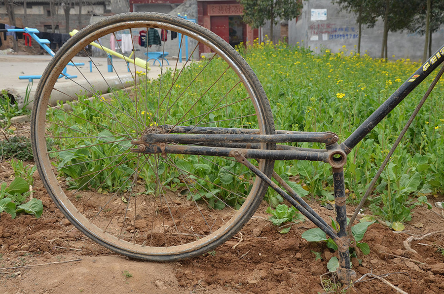 它現(xiàn)在的作用是鋤的角色,多少還有點兒犁的意思,但前身是一輛二八型的大自行車,仔細觀察了一下,這個輪子應(yīng)該是車子的后輪。
