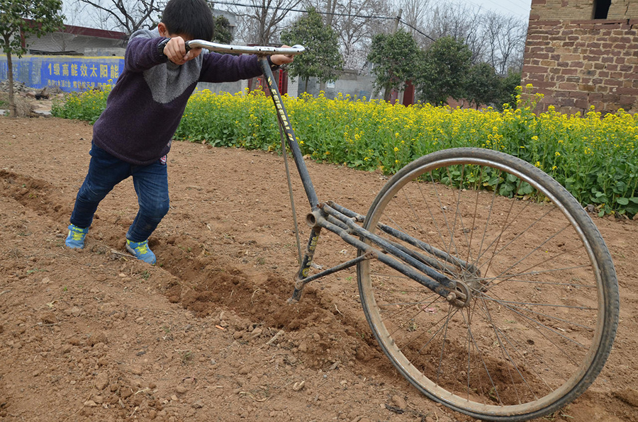 這種種菜的小地塊,推拖拉機過來翻有點兒擱不住,拿鋤頭鋤又有些費力,還好有這個神奇單車,連小孩子都能干活了。