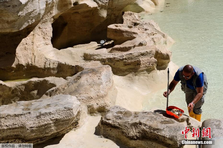 當?shù)貢r間2017年5月2日,意大利羅馬,一名工人在特萊維噴泉里收集硬幣。每年從噴泉里收集到的硬幣大約價值100萬歐元。