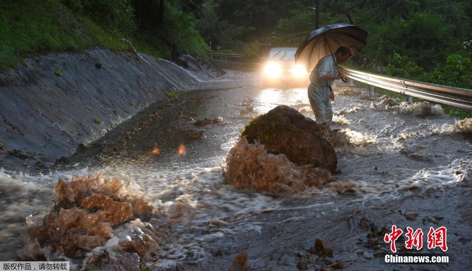 當(dāng)?shù)貢r間2017年7月5日,臺風(fēng)“南瑪都”為日本九州地區(qū)帶來強(qiáng)降雨。圖為九州島大分縣,大雨導(dǎo)致巨石滾落,交通癱瘓。