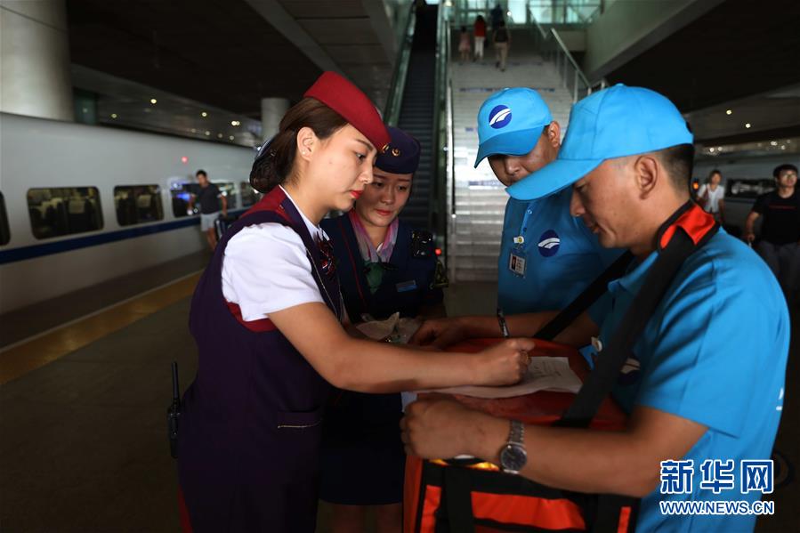 7月17日,在西安北站,配送員將餐食交給列車(chē)工作人員。當(dāng)日,鐵路部門(mén)在省會(huì)及計(jì)劃單列市所在地的27個(gè)主要高鐵客運(yùn)站,推出動(dòng)車(chē)組列車(chē)互聯(lián)網(wǎng)訂餐服務(wù),為旅客提供更多品種、口味的餐食服務(wù)。旅客可通過(guò)12306網(wǎng)站、手機(jī)APP等方式完成預(yù)訂。新華社發(fā)(張?chǎng)?攝)