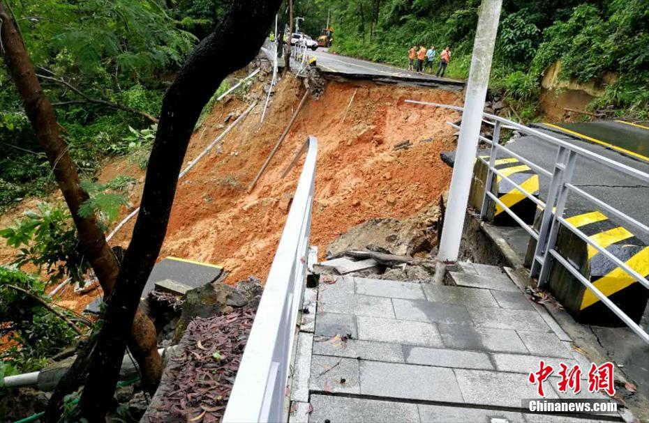 7月18日,深圳普降大暴雨局部特大暴雨,致部分路段嚴(yán)重積水、山體滑坡道路中斷、交通擁堵等險(xiǎn)情。深圳鹽田區(qū)盤山公路恩上路段出現(xiàn)滑坡,無人員、車輛被困;深鹽二通道下沙頭角出口匝道中間因山水傾瀉,道路中斷,交警已經(jīng)實(shí)施了交通管制。當(dāng)?shù)貧庀蟛块T先后發(fā)布了雷電、暴雨黃色、暴雨橙色和暴雨紅色分區(qū)預(yù)警信號(hào)。圖為深圳鹽田區(qū)盤山公路恩上路段出現(xiàn)滑坡道路中斷。中新社記者 鐘新 攝