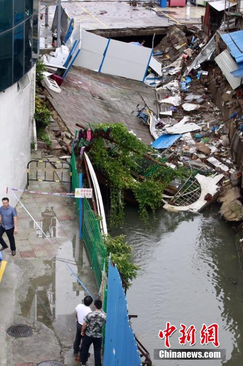 7月18日,深圳普降大暴雨局部特大暴雨,致部分路段嚴(yán)重積水、山體滑坡道路中斷、交通擁堵等險(xiǎn)情。深圳鹽田區(qū)盤山公路恩上路段出現(xiàn)滑坡,無人員、車輛被困;深鹽二通道下沙頭角出口匝道中間因山水傾瀉,道路中斷,交警已經(jīng)實(shí)施了交通管制。當(dāng)?shù)貧庀蟛块T先后發(fā)布了雷電、暴雨黃色、暴雨橙色和暴雨紅色分區(qū)預(yù)警信號(hào)。圖為深圳寶安區(qū)西鄉(xiāng)永安商業(yè)城門前區(qū)域坍塌,長(zhǎng)約15米、寬約6米的塌陷。中新社記者 鐘新 攝