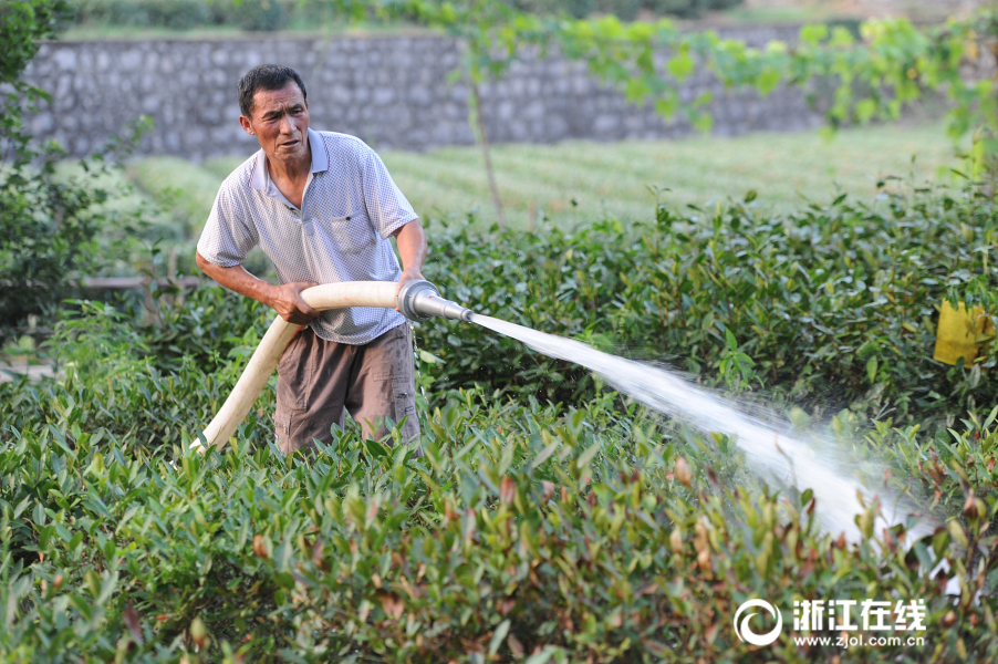 7月27日,熱浪滾滾,杭州西湖區(qū)梵村茶農(nóng)在自家茶園里,用高壓水槍為“受傷”的茶樹(shù)澆水。
