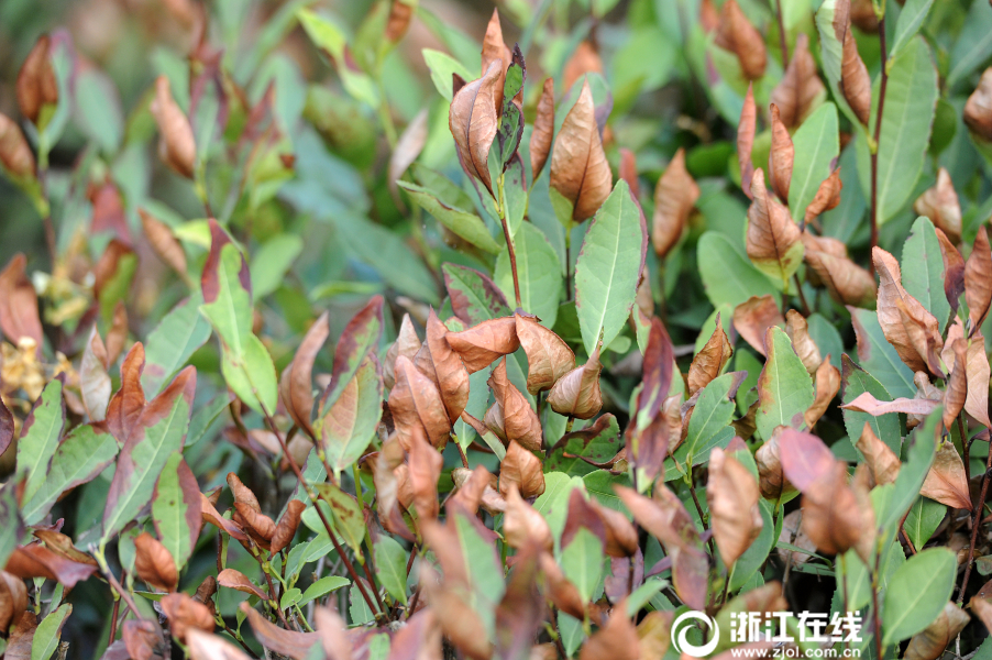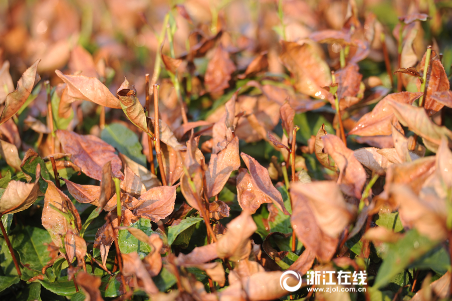 7月27日,熱浪滾滾,杭州西湖區(qū)梵村,龍井茶樹(shù)被太陽(yáng)烤成焦葉狀。