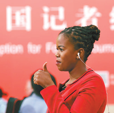 外國記者在十九大新聞中心進(jìn)行現(xiàn)場連線報(bào)道。 本報(bào)記者 雷 聲攝