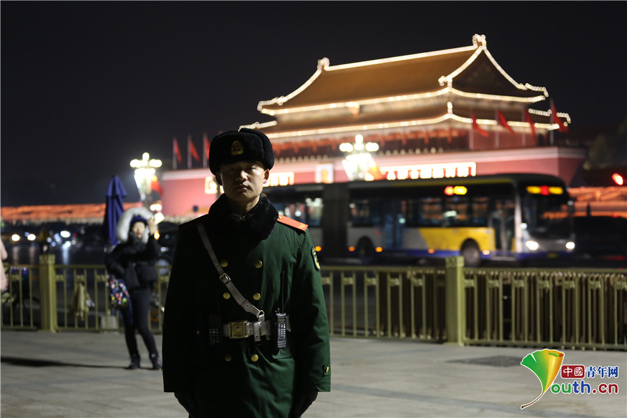 深夜執(zhí)勤的武警戰(zhàn)士。中國青年網(wǎng)通訊員 李超 攝