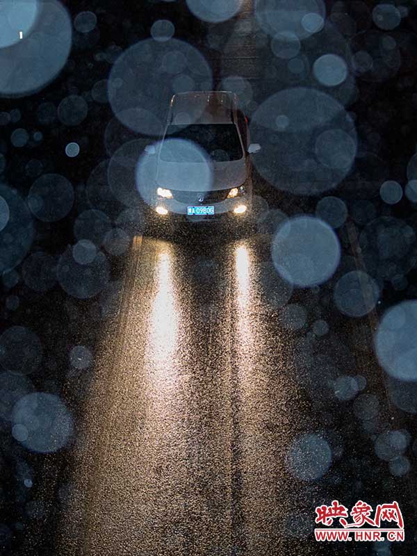 車燈前密集的雪花