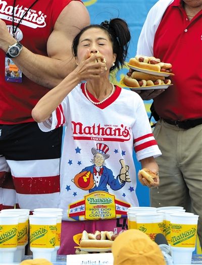 7月4日,紐約舉行吃熱狗大賽,參賽選手正大嚼熱狗。吃熱狗競賽是紐約康尼島慶祝獨(dú)立日的一項傳統(tǒng)趣味活動。新華社發(fā)