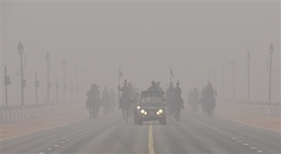 2016年1月7日,印度新德里,印度士兵在霧霾中進(jìn)行共和日閱兵彩排。印度媒體報(bào)道稱,機(jī)動(dòng)車排放是新德里空氣污染的重要原因。自今年1月1日起,新德里實(shí)行單雙號(hào)限行,交通擁堵情況得到明顯改善。