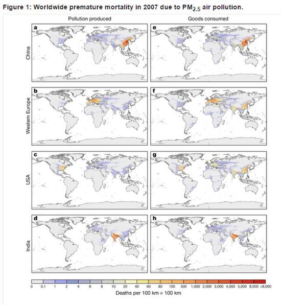另外,環(huán)環(huán)(ID:huanqiu-com) 發(fā)現(xiàn)這篇研究中提到,中國在全球貿(mào)易中所受到的污染影響更為嚴(yán)重。其中,中國有超過10.86萬人過早死亡與西歐、美國的消費相關(guān)聯(lián)。
