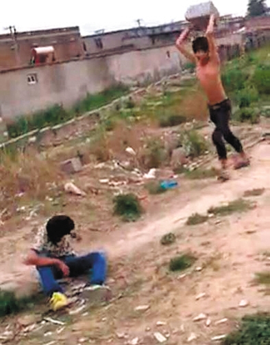 視頻顯示,6分45秒時,一名打人者搬起一塊石頭,向少年背部砸去。隨后,該男子再次搬起石塊,向后走幾米遠(yuǎn),舉起石塊朝少年頭上砸。少年當(dāng)場昏厥,打人者則對著少年臉部撒尿。