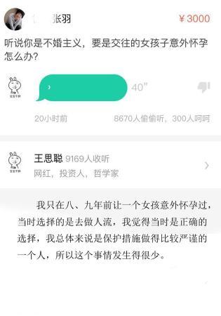 近日,某醫(yī)院醫(yī)生張羽在某平臺中向王思聰提問:“聽說你是不婚主義,要是交往的女孩子意外懷孕怎么辦?”在40秒的回答中,王思聰爆料自己毫不手軟:“我只在八九年前讓一個女孩意外懷過孕,但后來大家的選擇是流掉,我覺得是正確的選擇。 但現(xiàn)在我的保護措施是非常好的,一般不會有意外了?!鼻巴巴德牎钡木W(wǎng)友們紛紛表示:“老公坦誠得讓我震驚啊……”“感覺要上娛樂八卦頭條的節(jié)奏!”