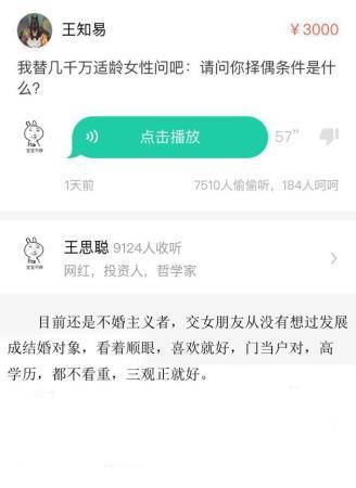 有網(wǎng)友代表幾千萬適齡女性向王思聰發(fā)問,“你的擇偶標(biāo)準(zhǔn)是什么”,王思聰坦言:“說實話,沒有考慮沒有想過這些問題,首先我目前是不婚主義者,沒想過要結(jié)婚,交女朋友有交,但從沒想過發(fā)展成結(jié)婚對象,至于交女朋友標(biāo)準(zhǔn),其實沒什么標(biāo)準(zhǔn),我喜歡就好,我和一般傳統(tǒng)家庭或是老一代的人思想不太一樣,沒想過要門當(dāng)戶對,高學(xué)歷啊,知書達(dá)理啊這些,都不是很看重,三觀正比較重要,再就是我喜歡,我看順眼就好,其他真的沒別的標(biāo)準(zhǔn)了?!?/p>
