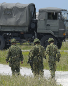 日本防衛(wèi)省計劃讓陸上自衛(wèi)隊員荷槍實彈,守衛(wèi)“愛國者-3”地對空攔截導彈。圖為4月4日,日本自衛(wèi)隊員在石垣島新港地區(qū)展開部署。(共同社)