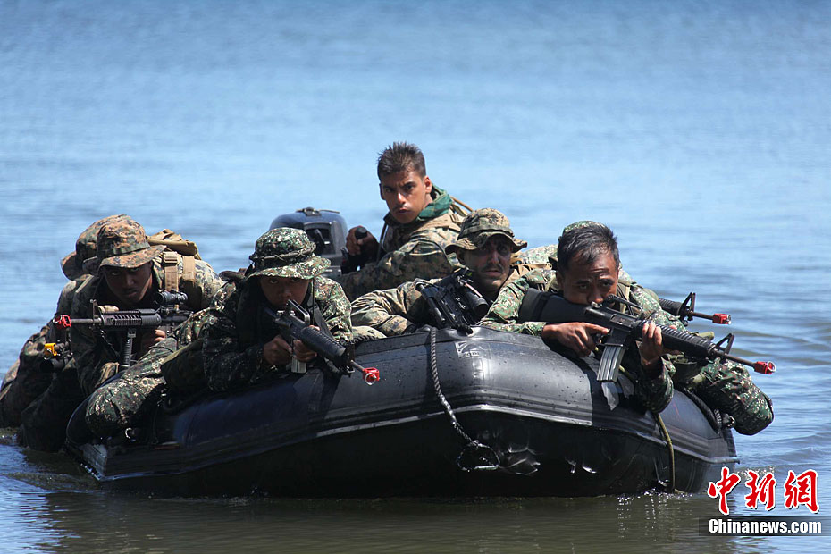 4月25日,美國與菲律賓“肩并肩2012”聯(lián)合軍演參演部隊(duì)在菲律賓南部巴拉望省普林塞薩港市的阿魯甘灣舉行“兩棲登陸”演練,美菲雙方近百名海軍陸戰(zhàn)隊(duì)士兵參加。這也是美菲“肩并肩2012”聯(lián)合軍演開幕10天以來,開放媒體采訪規(guī)模最大的一場軍事演習(xí)活動(dòng)。圖為美菲海軍陸戰(zhàn)隊(duì)士兵混合編隊(duì),搭乘小艇抵達(dá)演習(xí)地點(diǎn)。張明 攝