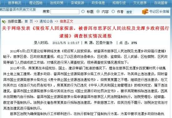 關于網(wǎng)絡發(fā)表《現(xiàn)役軍人回家探親,被普洱市思茅區(qū)人民法院及龍?zhí)多l(xiāng)政府強行逮捕》調查核實情況通報