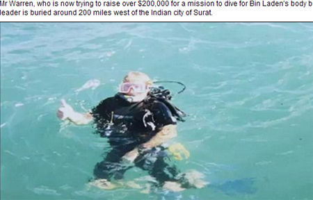 這位尋寶者名叫比爾·沃倫(Bill Warren),現(xiàn)年60歲。他稱發(fā)現(xiàn)了拉登遺體的具體位置,就在距離印度西部港口城市蘇拉特(Surat)以西320公里處的阿拉伯海底。他現(xiàn)在正努力籌集20萬美元(約合126萬元人民幣)經(jīng)費,以潛入海底尋找拉登的裝尸袋。