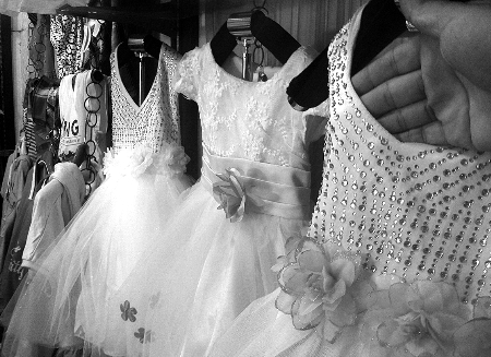 “這個送珍珠腰帶,走(賣)得可好,帶一件吧!”昨天下午2點,鄭州市豐產(chǎn)路某店鋪內,女老板正在向一位女士推銷熱賣的“公主裙”。仔細看,這條粉紅色的裙子,腰間綴著由花生米大小的“珍珠”做的腰帶,袖口邊緣處還貼著亮閃閃的貼片,看著確實華麗。經(jīng)過一番討價還價,該女士花100元為上幼兒園的女兒買了條裙子。令她不滿意的地方,就是似乎珍珠腰帶縫得并不緊,“珍珠是一根單線穿下來的,穿不了幾次,就該斷了”。