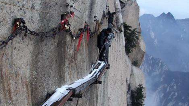 華山長(zhǎng)空棧道上“最危險(xiǎn)的掃雪人”