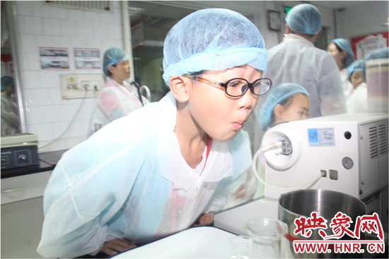 穿上白色的參觀服、戴上一次性帽子,受邀家庭進(jìn)入了檢測區(qū),參觀了質(zhì)量控制的檢測工作流程。正在工作的品控員,現(xiàn)場邀請(qǐng)了一名小朋友進(jìn)行了其中一項(xiàng)檢測--白利度檢測。“簡單來講,就是利用密度儀,測試一瓶飲料的糖度和含氣量兩個(gè)指標(biāo)?!逼房貑T張青介紹道。