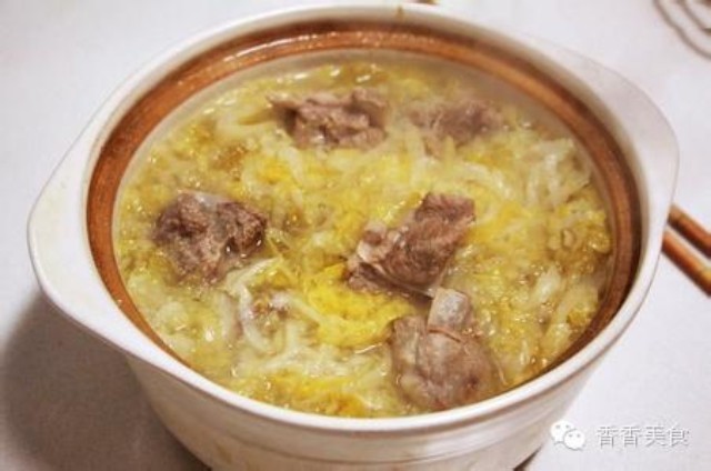 1、先將排骨過開水燙去血沫。買來的酸菜切小塊,將酸菜的厚幫子片成薄片,在冷水中浸泡一會兒。蔥姜切沫。