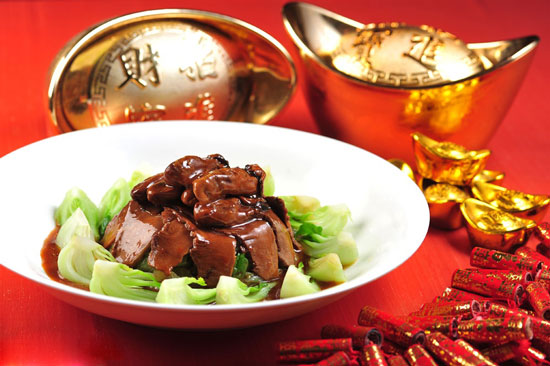 廣東人把年夜飯稱為“團(tuán)年飯”,不但飯菜品種豐富,而且很講究意頭。一家人吃團(tuán)年飯前要先祭祖或拜神,香燭燒完才開飯。席上一般有雞(寓有吉)、魚(寓年年有余)、蠔豉(寓好市)、生菜(寓生財(cái))、腐竹(寓富足)、蒜(寓會(huì)計(jì)算)等以求吉利。廣東有的地方在吃團(tuán)年飯時(shí),若有新婚夫婦,會(huì)多擺一副碗筷,取來年添丁吉意。