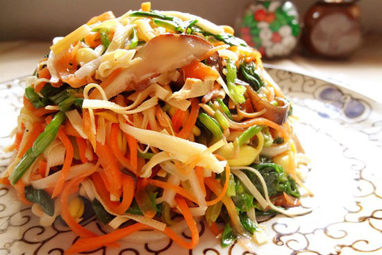 《金陵歲時(shí)記》記載了南京人除夕的“十景菜”(也叫什錦菜),人們以醬姜、黃瓜、胡蘿卜、金針菇、木耳、冬筍、白芹、醬油干、百葉、面筋十種,細(xì)切成絲,以油炒之,這就是所謂的“十景”。這些菜都有著美好的寓意:黃瓜,象征瓜瓜連連、子孫蔓延;冬筍,象征雨后春筍節(jié)節(jié)高;百葉,象征百依百順樣樣順,都是要討個(gè)吉利的口彩。現(xiàn)在的什錦菜已經(jīng)不止10種了,甚至多達(dá)16-18種,增加了藕,象征路路通;黃豆芽,象征如意;薺菜,象征聚財(cái);馬齒莧,南京又稱安樂菜,象征平安喜樂。