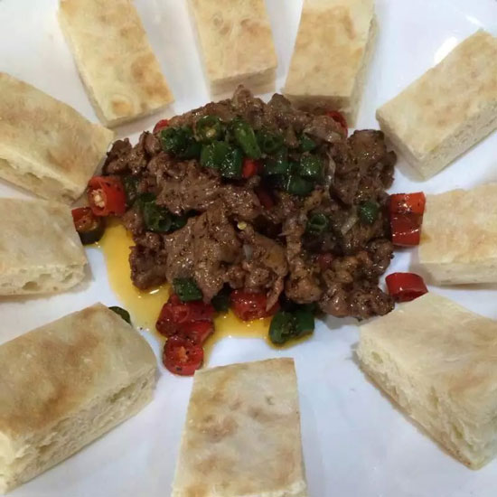 4、鍋中留少許油,將蔥花,蒜蓉炒香,然后倒入滑過油的牛肉,加入鹽,味精,雞粉,蠔油,黑胡椒,最后加入適量辣椒油翻炒均勻就可以出鍋了,再搭配上松軟可口的發(fā)面餅。
