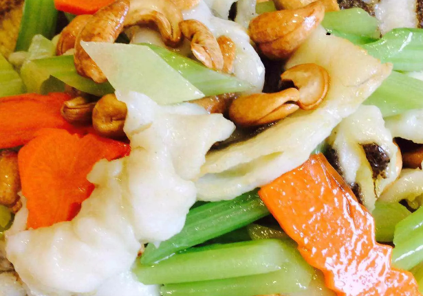 5、鍋置于火上,少量油燒熱,倒入姜片和胡蘿卜片,然后倒入焯過(guò)水的芹菜,翻炒片刻倒入魚(yú)肉,然后加入鹽,味精,香油,淀粉,一點(diǎn)清水,翻炒片刻,最后加入腰果翻炒均勻即可,最后在魚(yú)骨上撒上椒鹽就可以了。