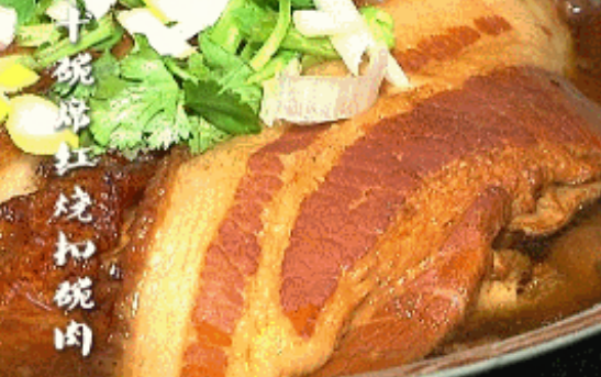 選用優(yōu)質五花肉,切成大塊,在白蘿卜水中上色。七成油溫浸炸至七分熟,撈出的五花肉顏色金黃,與用蜂蜜上色效果差不多。