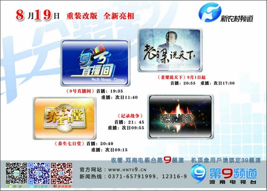 8月19日新農(nóng)村頻道全新亮相!19:35《9號(hào)直播間》;20:40《養(yǎng)生七日堂》;21:45《記錄戰(zhàn)爭(zhēng)》;四檔電影,視覺(jué)盛宴!14:43《第9放映室午間版》,17:55《群影匯》,22:00《第9放映室》,23:50《午夜影吧》,河南9套好電影,精彩不斷連連看!
