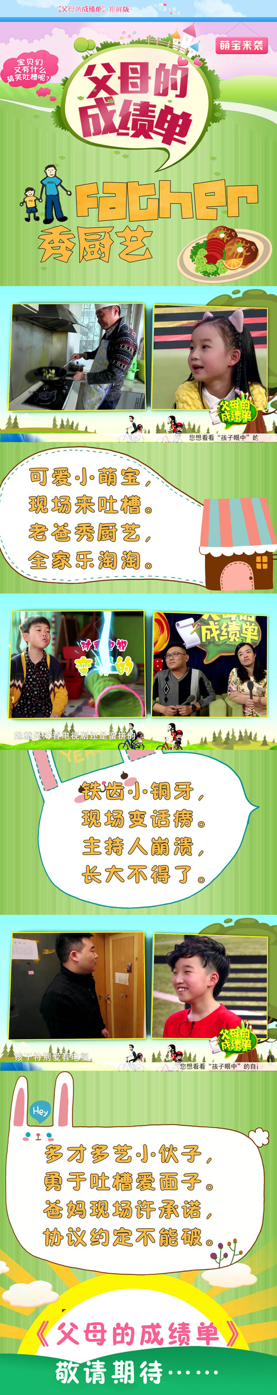 《父母的成績單》河南衛(wèi)視(周一晚)21點(diǎn)15分播出!想了解這期節(jié)目中孩子們有哪些雷人吐槽嘛,想知道父母們的精彩表現(xiàn)嗎?先來看看下面的圖文花絮感受一下吧。