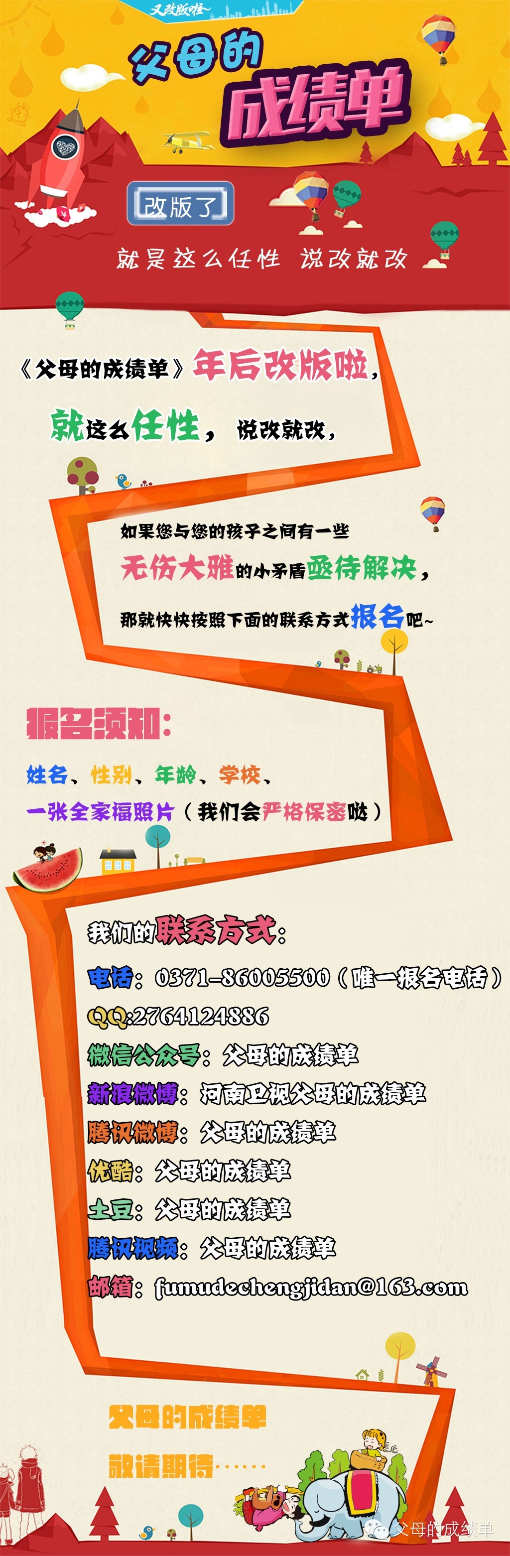 年后,經(jīng)過(guò)導(dǎo)演大大和眾小編們的熱切商討,《父母的成績(jī)單》又改版啦。我們就是這樣任性,說(shuō)改就改,為了什么?為了讓可敬可愛(ài)的觀眾朋友們看到更優(yōu)質(zhì)更具有內(nèi)涵的節(jié)目,希望你們能喜歡我們的節(jié)目,能感受到我們每一位幕后工作者的用心付出。我們真誠(chéng)的期望每一位家長(zhǎng)都能耐心的用更好的方式來(lái)與您的孩子溝通相處,更期望每一位孩子都能健康快樂(lè)的成長(zhǎng)。