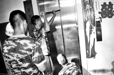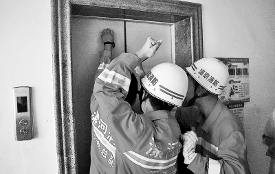 漯河消防官兵試圖打開(kāi)電梯門(mén),救出被困的人。