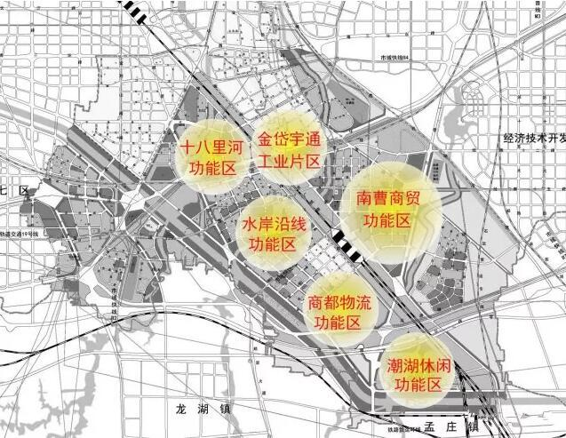 商都新區(qū)沒有單一明確的功能劃分,整個區(qū)域從北到南依次分為六大功能區(qū),包括包括金岱宇通工業(yè)片區(qū),十八里河功能區(qū),水岸沿線功能區(qū),商都物流園功能區(qū),南曹商貿功能區(qū)和潮湖休閑功能區(qū)。