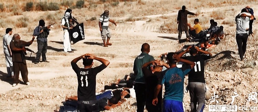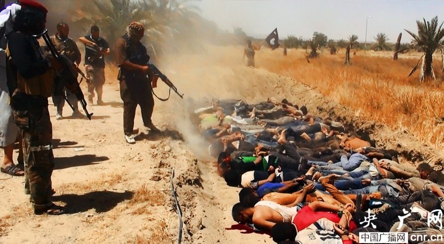當?shù)貢r間2014年6月14日,伊拉克薩拉赫丁,伊拉克極端武裝“伊拉克和黎凡特伊斯蘭國”武裝人員處決大量俘虜?shù)囊晾耸勘?/p>