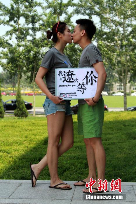 6月23日,情侶拿著“我在遼大等你!的牌子在拍照。當日,遼寧大學攝影協(xié)會推出一組遼大創(chuàng)意“招生名片”的圖片,數(shù)位帥哥靚妹抓人眼球。中新社發(fā) 于海洋 攝