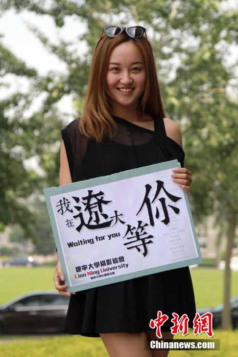 6月23日,美女拿著“我在遼大等你!的牌子在拍照。當日, 遼寧大學攝影協(xié)會推出一組遼大創(chuàng)意“招生名片”照片,在網(wǎng)絡爆紅出鏡的數(shù)位帥哥靚妹抓人眼球。中新社發(fā) 于海洋 攝