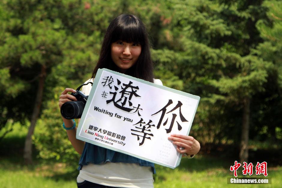 6月23日,美女拿著“我在遼大等你!的牌子在拍照片。當日, 遼寧大學攝影協(xié)會推出一組遼大創(chuàng)意“招生名片”照片,數(shù)位帥哥靚妹更是抓人眼球。中新社發(fā) 于海洋 攝