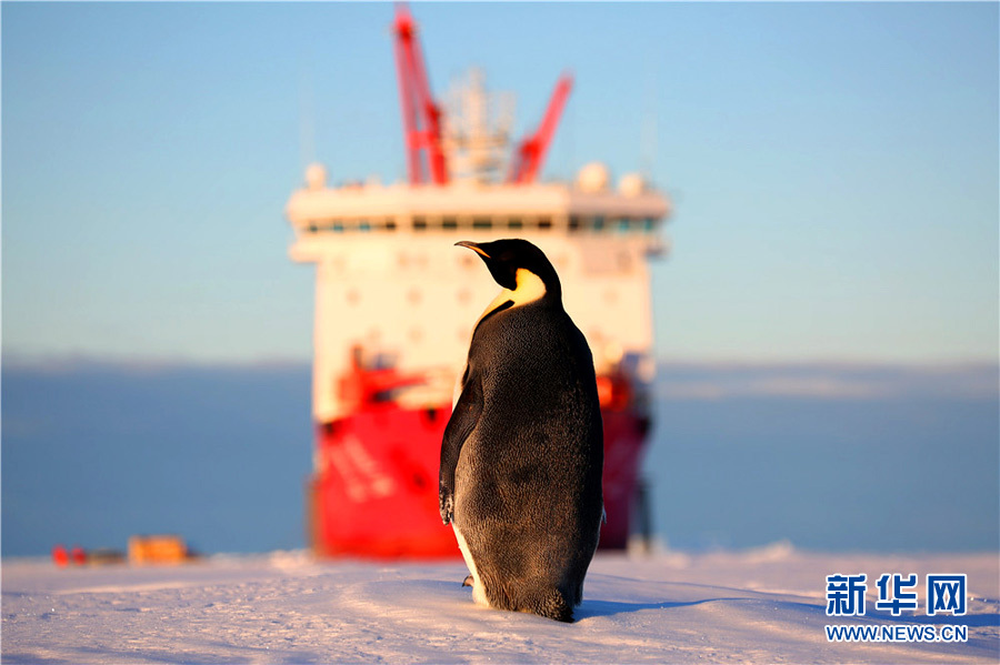 12月7日,一只帝企鵝在展開卸貨作業(yè)的“雪龍”號(hào)旁。 “雪龍”號(hào)自12月1日起在中山站外陸緣冰地帶展開冰上卸貨作業(yè),預(yù)計(jì)將于12日離開,前往羅斯海域開展大洋調(diào)查。 新華社記者 白陽(yáng) 攝