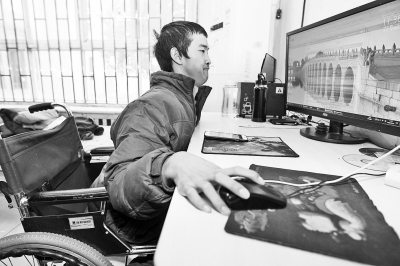 來(lái)福利院時(shí),他帶來(lái)了心愛(ài)的“寶貝”,是爺爺為他買(mǎi)的電腦。從小到大,輪椅上的他,自學(xué)電腦,并通過(guò)電腦了解到外面的世界。
