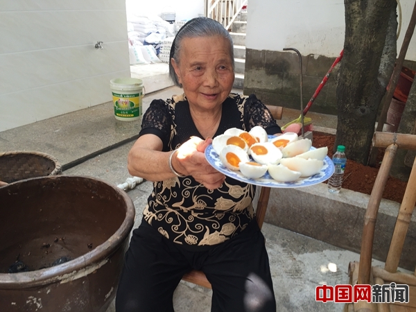 瑞金市壬田鎮(zhèn)鳳崗村,“鴨蛋代言人”廖奶奶向大家展示自家制作的鴨蛋。中國網(wǎng)記者 尚陽 攝