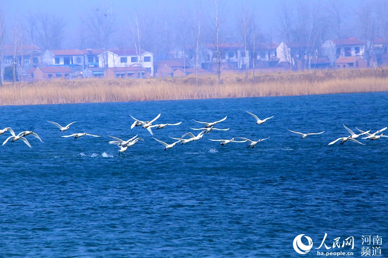 人民網(wǎng)鄭州3月14日電 (黃莎)春到黃河故道,和風(fēng)送暖,綠柳吐翠。近日,河南省民權(quán)黃河故道國家濕地公園迎來一批“稀客”—— 一碧萬頃的龍澤湖湖面游蕩著數(shù)百只白天鵝。春水浩渺,天鵝起舞,給早春的黃河故道濕地公園增添了一道亮麗的風(fēng)景線,吸引大批游人駐足靜賞。