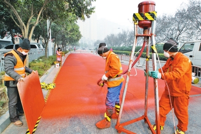 “機(jī)動(dòng)車道6米寬,鋪設(shè)‘綠道’的自行車道也為6米寬??磻T了灰黑色的路面,在看到色彩明銳的‘綠道’后肯定覺(jué)得眼前一亮。‘綠道’只是叫法,并不是說(shuō)道路外觀一定是綠色的,在景觀設(shè)計(jì)中,‘綠道’往往有著更深更廣的內(nèi)涵?!惫こ特?fù)責(zé)人呂先生告訴記者,彩色瀝青厚度僅為1到2毫米,壽命在5年以上,具有警示、防滑、降噪、美觀等特點(diǎn)?!拔覈?guó)‘綠道’通常以警示色紅色為主打,主要作用是打造人車分離模式,供騎車者和步行者休閑使用。”